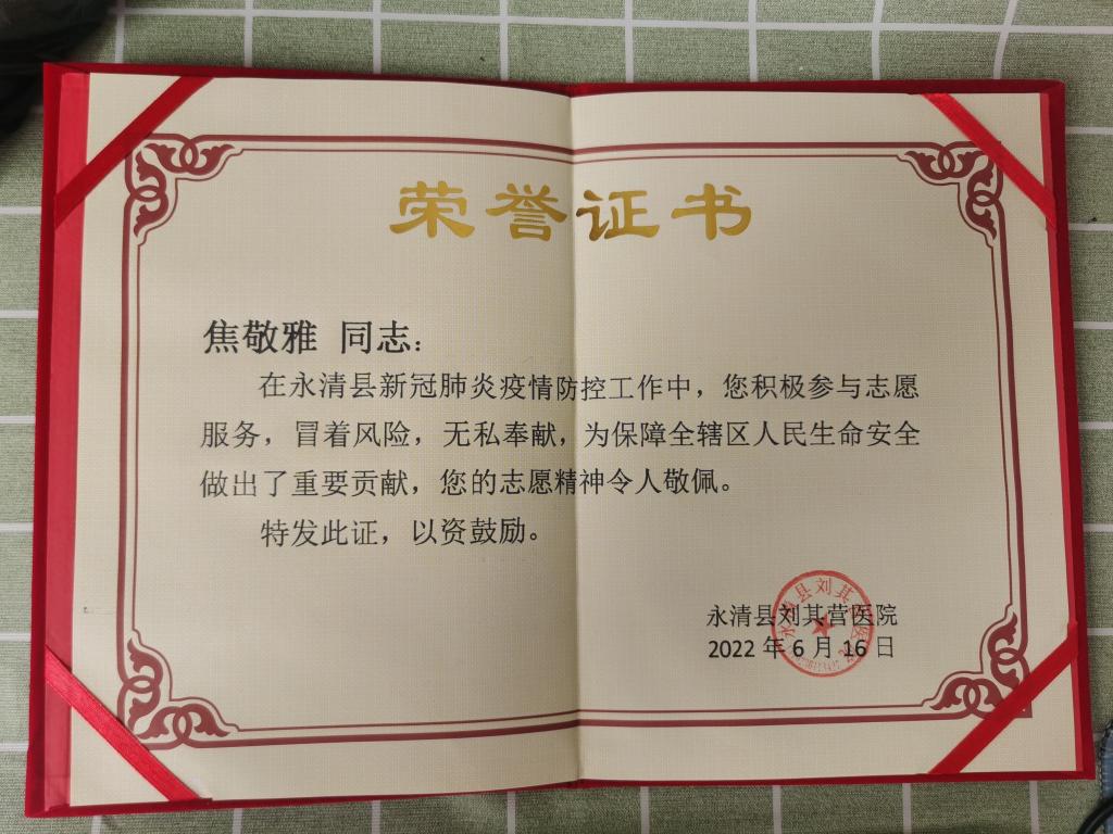 软件工程系的老师、学生积极投身抗疫工作一线, 他们协助医护人员有序组织居民、村民进行核酸检测、配合小区物业(村委会)为居民们提供所需物品、在各点位站岗、开展测温等工作,不怕苦、不怕累,致力为居民提供贴心的服务和帮助,为自己家乡的疫情防控工作做出了贡献。永清县刘其营医院对焦敬雅同志在此次疫情中所做的工作给予了高度评价,并授予了荣誉证书。
